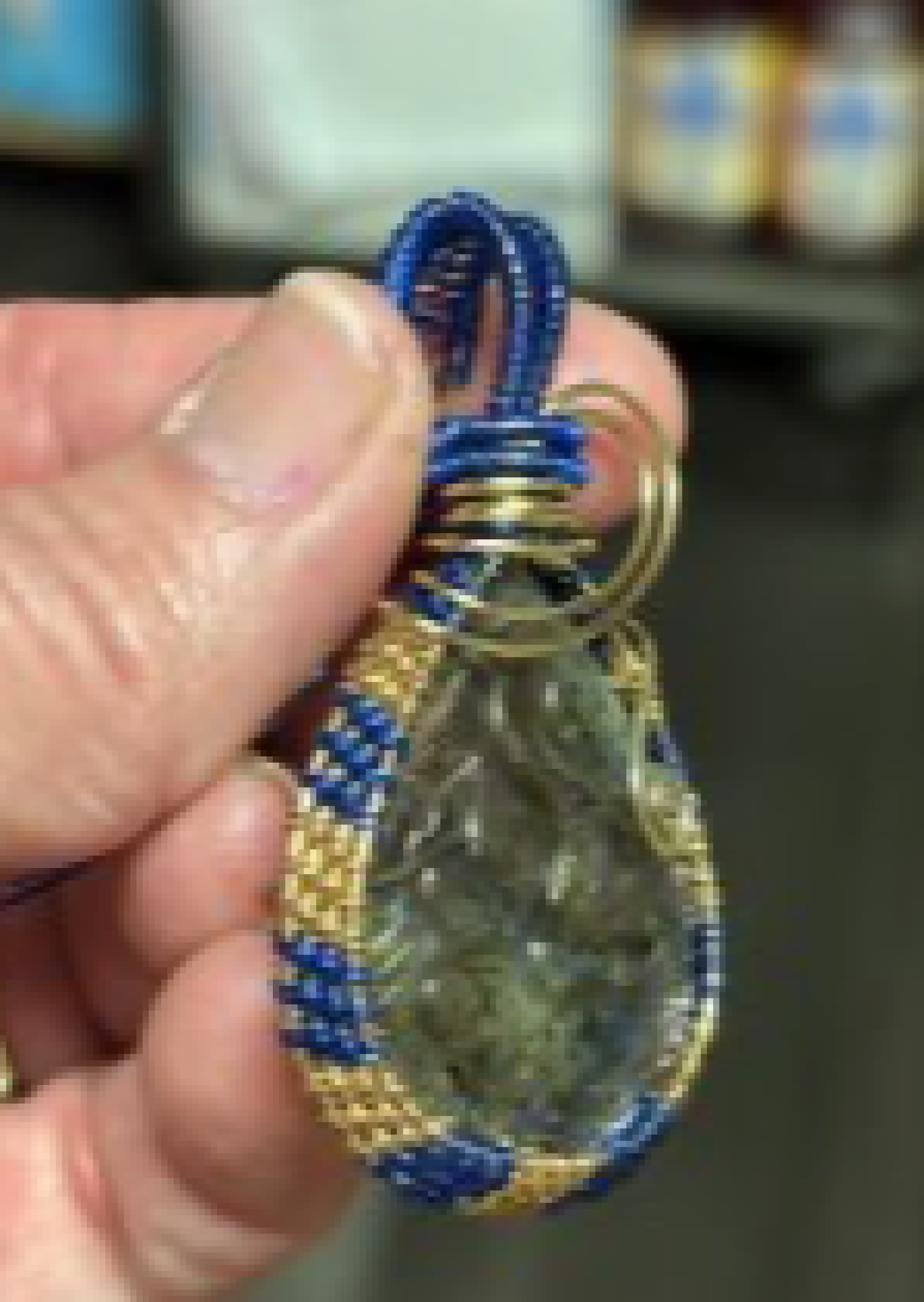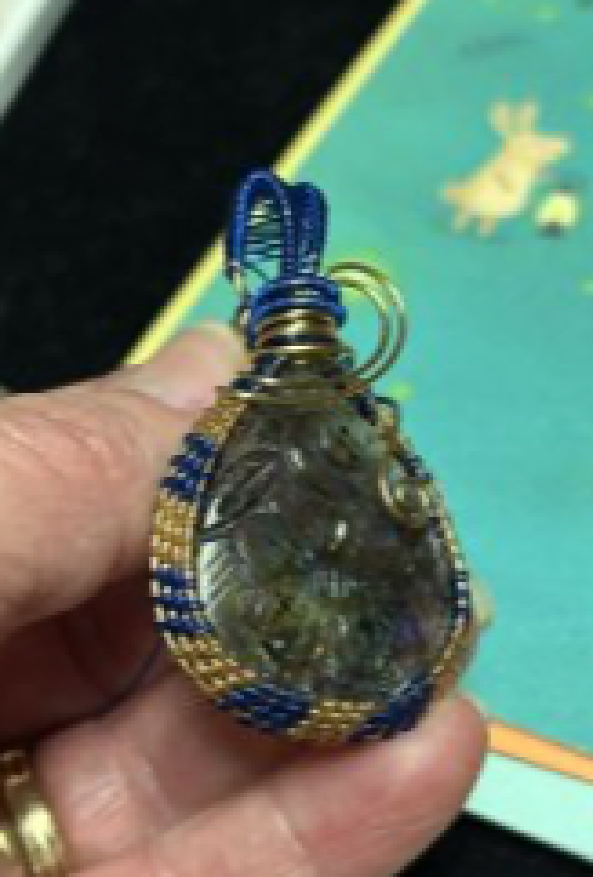 A gorgeous, super flashy Labradorite beautifully dressed in gold and blue wire. This beauty comes with your choice of a leather cord or a gold chain.
