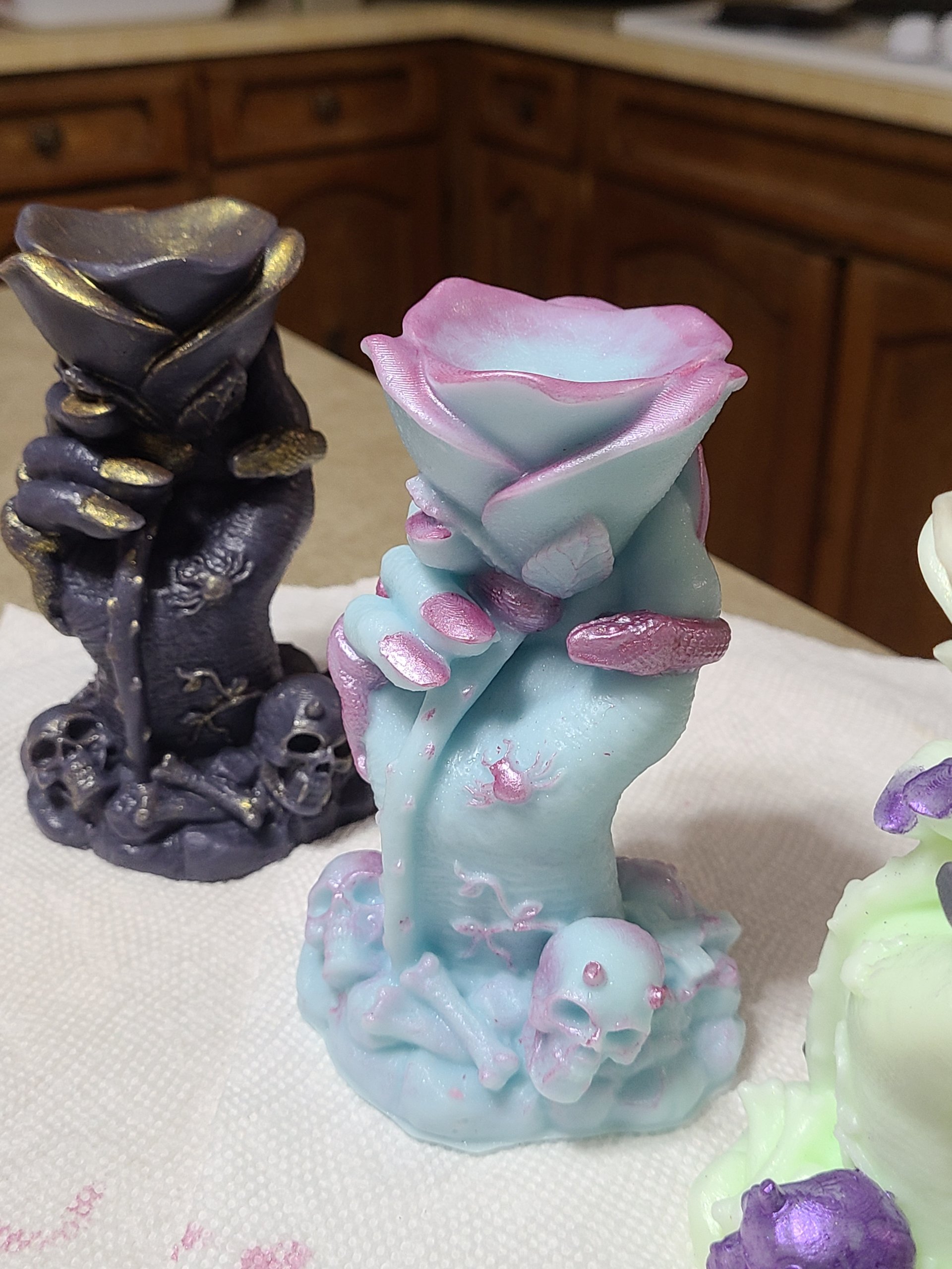 Choose your own scents, colors and embellishments for a beautifully unique gift! Our Witch's Rose candles are made with parasoy wax, premium fragrances & dyes, and clean burning wicks then hand-painted in shimmery micas for a beautifully unique finish.