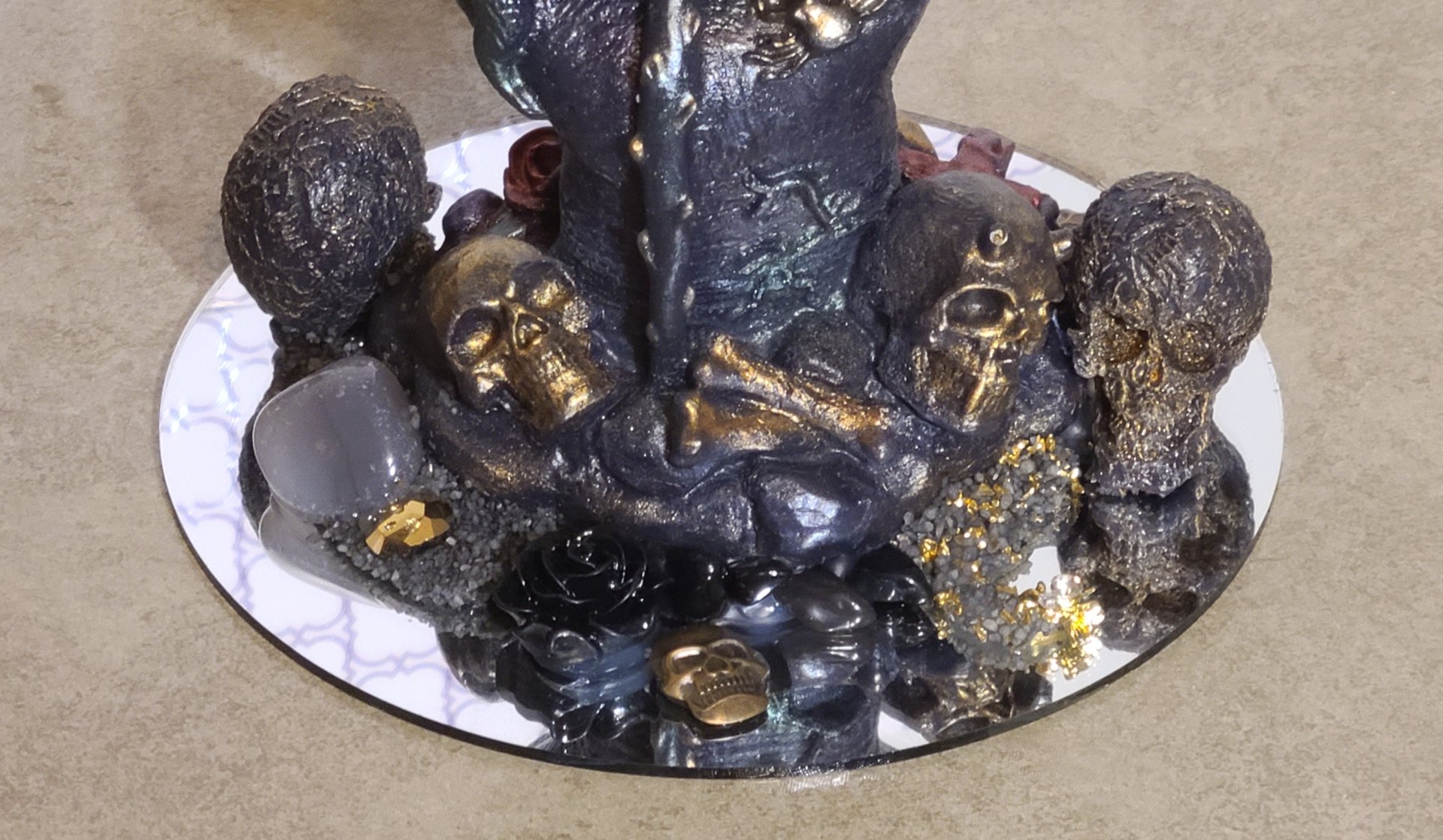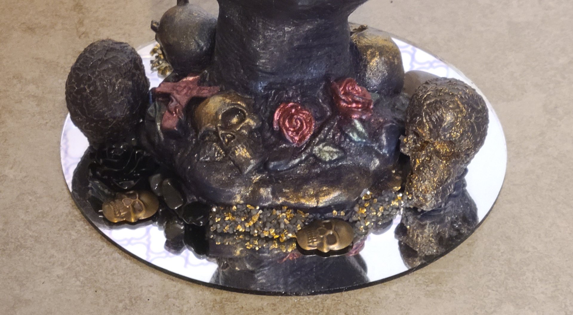 You can also add a mirror base with embellishments of wax skulls, stones, spiders and other charms. Embellishments include small charms, beads and rhinestones (see last five pictures).