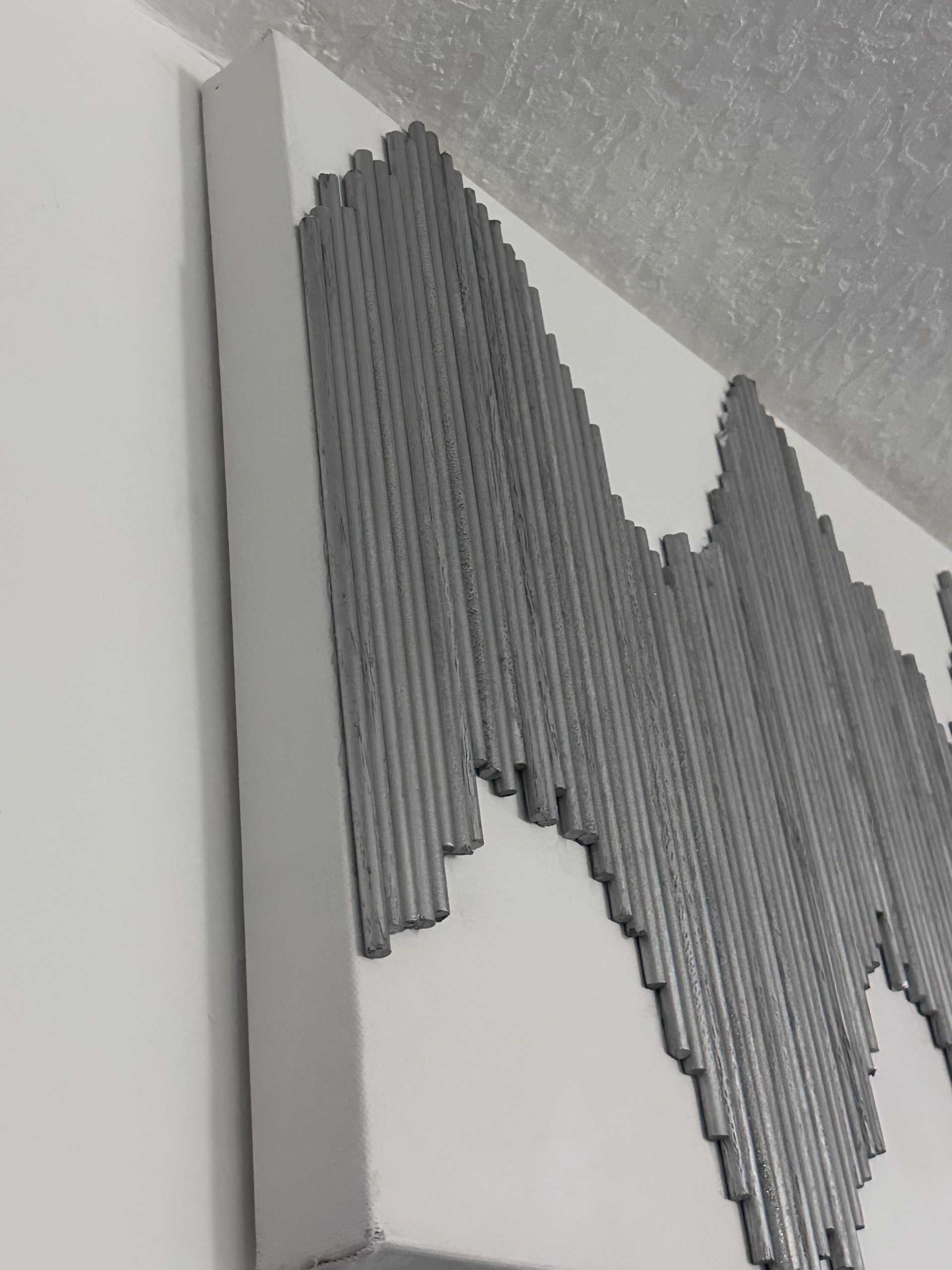 Level 3 canvas and various length wooden dowels, spray painted in silver