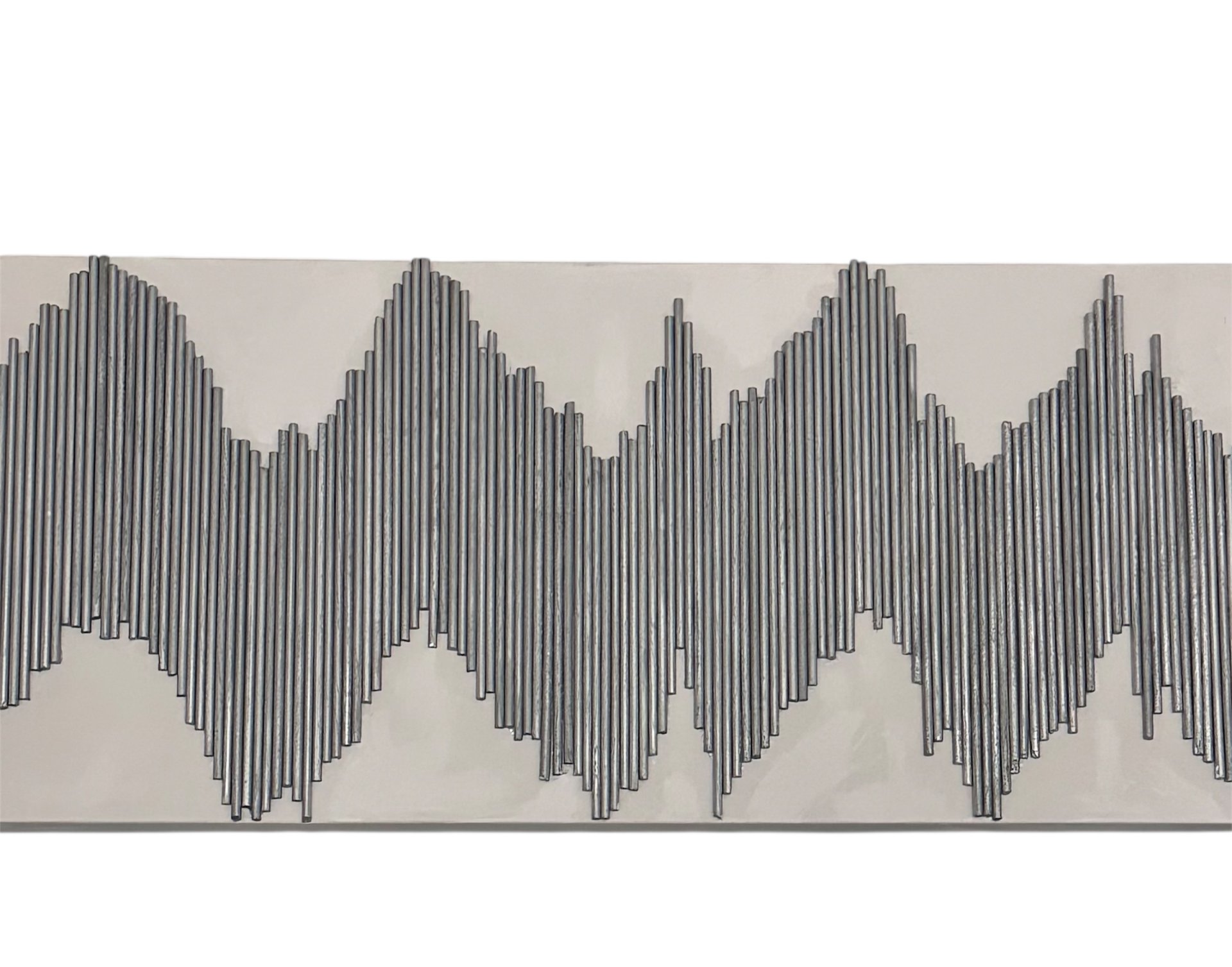 Dowels in Motion, a 3D wall art sculpture, invites you to experience movement captured in a quiet, tactile rhythm. This sculptural piece arranges wooden dowels of varying lengths in a closely packed formation on top of a clean, rectangular white base. The dowels rise and fall in a wave-like pattern. Their uniform cylindrical shapes contrast with the dynamic, jagged flow they create together. The shifting heights suggest a subtle dance, evoking the sensation of motion frozen in time. The use of wood adds warmth and tactility to the composition.